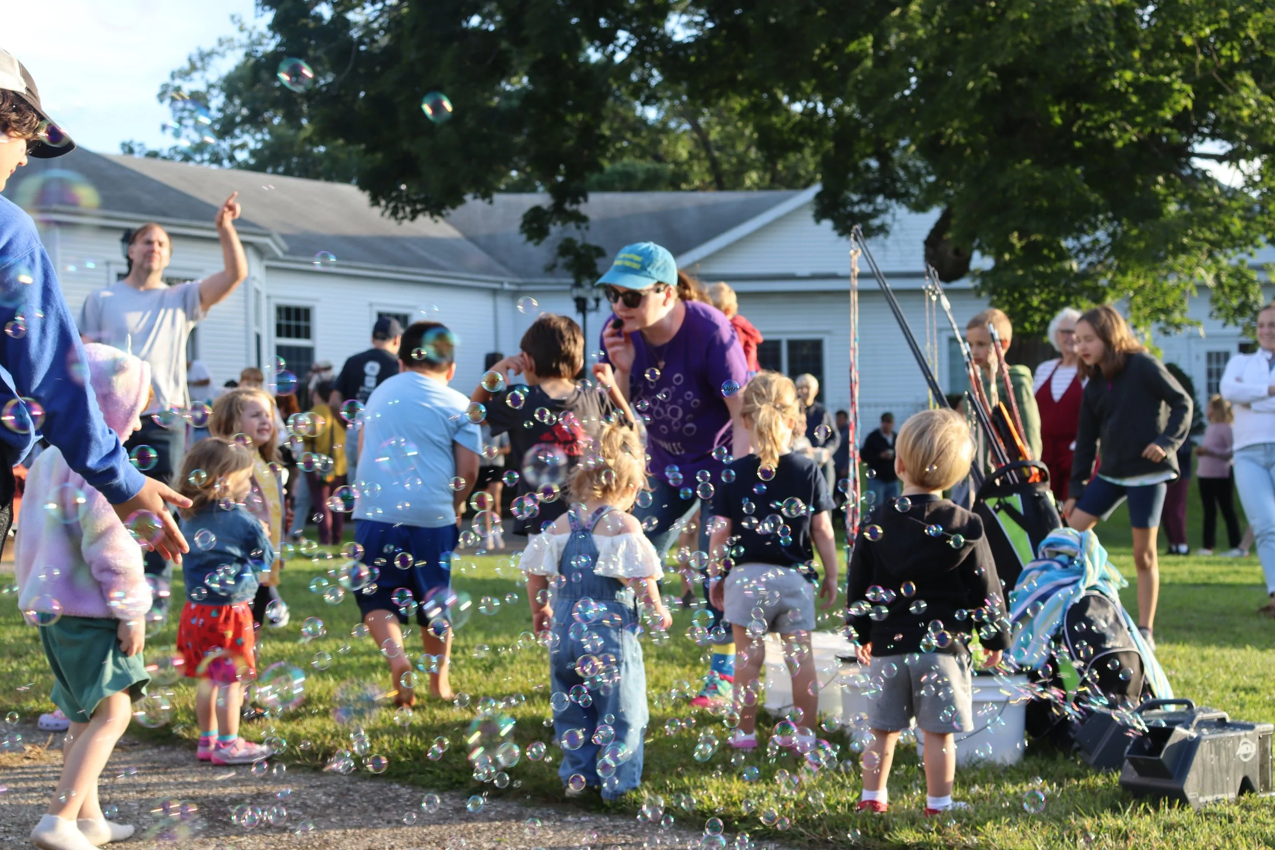Family Fun Night - features a bouncy house, bubble show, temporary tattoos, yard games, storytelling, ice cream, hot dogs, and more -- all for free! DRC typically hosts this wonderful event on the church's front lawn on the third Wednesday in August each year. The invitation extends to everyone (featured in the photo above).